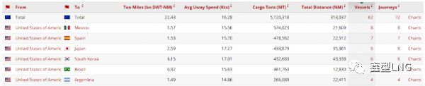 下圖顯示了大型液化天然氣運(yùn)輸船(LNG)從美國(guó)出口運(yùn)輸?shù)那闆r。