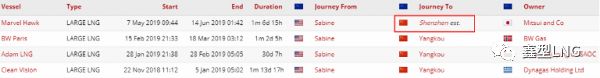 從液化天然氣氣體運(yùn)輸船的貿(mào)易航次記錄中我們也可以發(fā)現(xiàn):2019年初至今,僅有4艘LNG運(yùn)輸船涉及美國(guó)到中國(guó)的貿(mào)易航線,其中包括3個(gè)已完成的航次,以及1個(gè)正在進(jìn)行的航次。這些航次只包括直運(yùn),并不涵蓋在中轉(zhuǎn)地進(jìn)行臨時(shí)儲(chǔ)存的船舶。